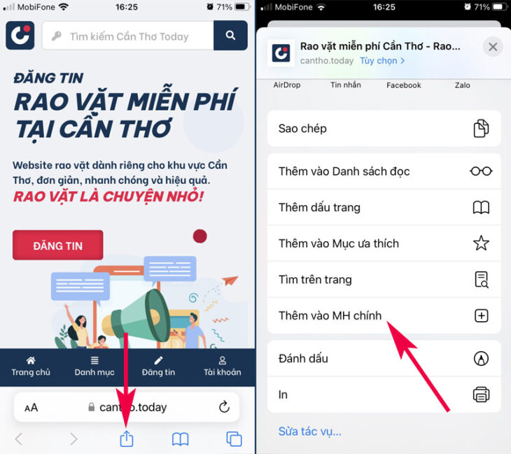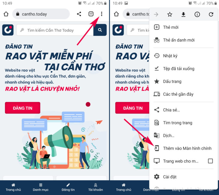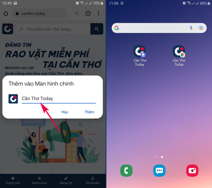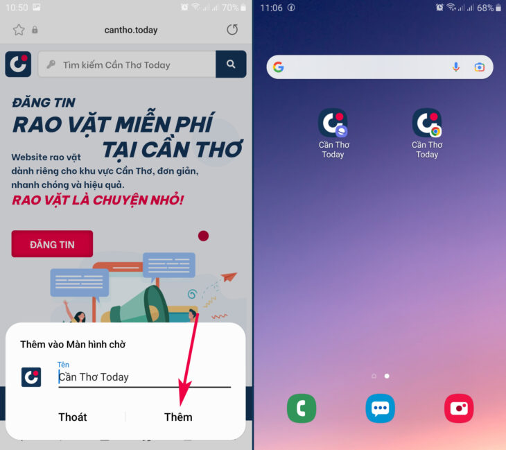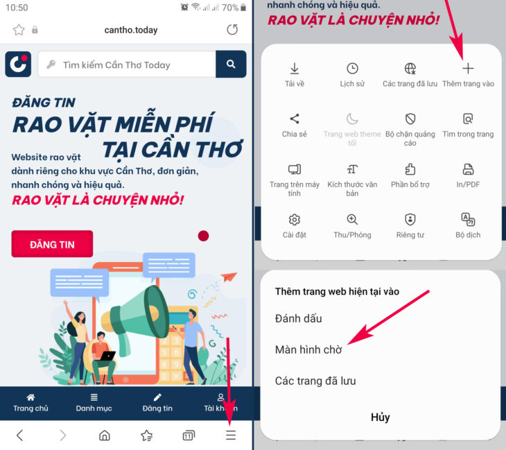Nếu việc truy cập là thường xuyên, hãy thử ngay cách này để có thể mở trang web nhanh hơn, đó là tạo một biểu tượng trên màn hình điện thoại như một biểu tượng ứng dụng để khi nhấp vào sẽ mở ngay trang web mà không cần thao tác khác, dưới đây là một ví dụ để lưu trang tin Cần Thơ Today https://cantho.today vào màn hình chính, hãy xem hình ảnh minh họa cho 3 trình duyệt web phổ biến hiện nay: