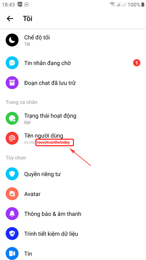 2. Từ ứng dụng Messenger trên điện thoại, bạn có thể nhấp vào avatar trên góc trái để xem các thông tin và cài đặt, bạn sẽ tìm thấy Tên người dùng như hình sau: